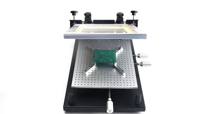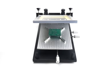 The operation of the printer is simple. First, clamp a framed stencil (available at very low cost from most PCB manufacturing houses) into the printer. Then, place the PCB on the included locator fixtures. Using the Vernier controls, move the PCB fixture until the solder pads perfectly align with the holes. Finally, move the solder over the stencil with the squeegee blade (included).