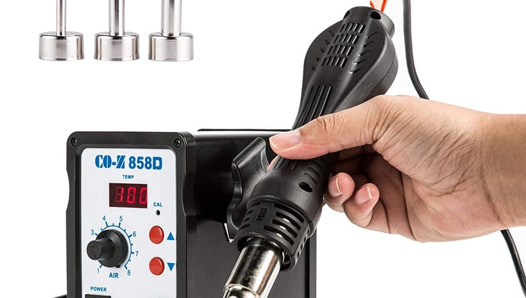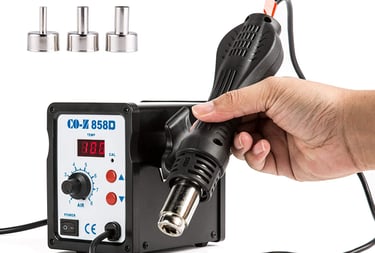 Designed for soldering or de-soldering SOIC, CHIP, QFP, PLCC, BGA, and other temperature sensitive components, an essential tool for cell phone repair, laptop repair, or circuit boards soldering. It can also