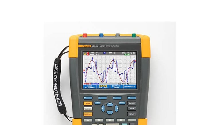 The Fluke MDA550 Motor Drive Analyzer, 4 Channel, 500 MHz with Motor Shaft and Harmonics simplifies complex motor-drive troubleshooting with guided test setups and automated drive measurements that provide reliable, repeatable test results on three-phase and single-phase inverter type motor-drive systems.