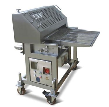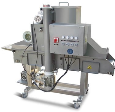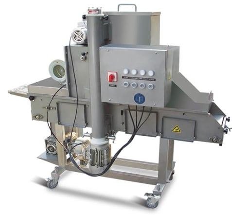 Hiwell Machinery SFJ200-II flouring machine has been widely applied to all kinds of flours and composite flours. This automatic flouring equipment transfers products to lower wire belt for flouring on bottom and sides, while flours fed from upper hopper covers tops of products. Compression rollers wait at the end of this food production line to ensure compacted flouring.